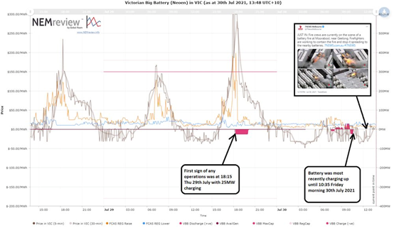 這張來自Watt Clarity的圖表顯示維多利亞大電池項目在周四做了一些測試,然后在周五早上又做了一次,就在火災(zāi)發(fā)生之前。