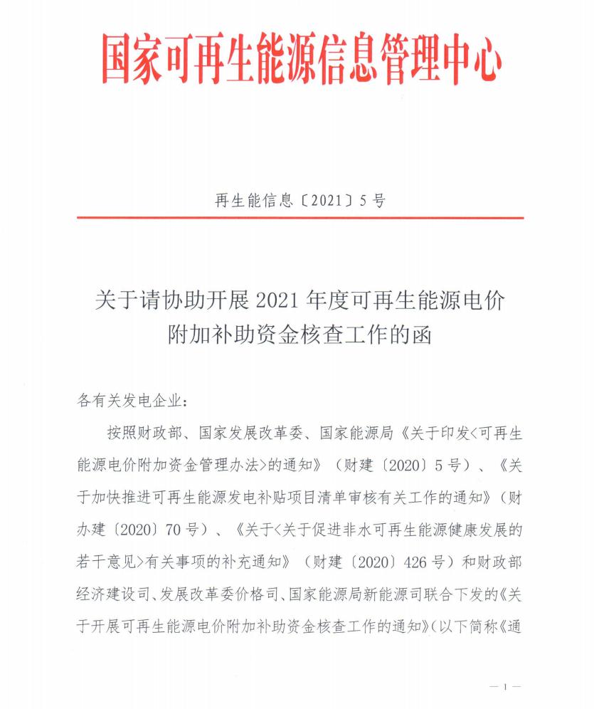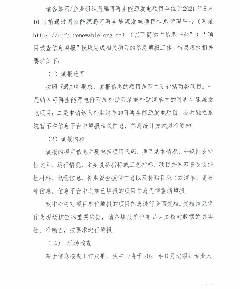 根據(jù)通知精神,國(guó)家可再生能源信息管理中心要求各集團(tuán)/企業(yè)組織所屬可再生能源發(fā)電項(xiàng)目單位于2021年8月10日前通過信息平臺(tái)“項(xiàng)目核查信息填報(bào)”模塊完成相關(guān)項(xiàng)目的信息填報(bào)工作。