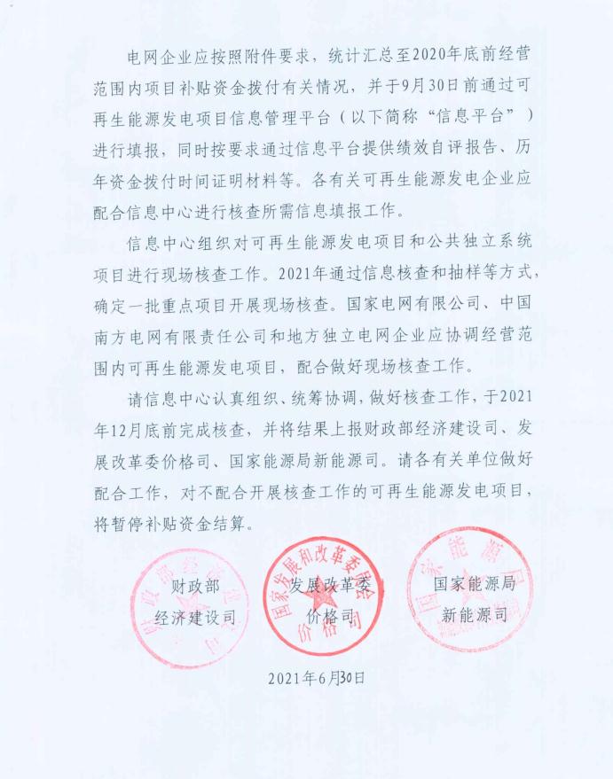 近日,財(cái)政部、國(guó)家發(fā)展改革委、國(guó)家能源局聯(lián)合印發(fā)《關(guān)于開展可再生能源電價(jià)附加補(bǔ)助資金核查工作的通知》,委托國(guó)家可再生能源信息管理中心對(duì)可再生能源電價(jià)附加補(bǔ)助資金使用情況及涉及項(xiàng)目進(jìn)行核查。核查范圍包括:獲得補(bǔ)貼資金的國(guó)家電網(wǎng)、南方電網(wǎng)、各省區(qū)地方獨(dú)立電網(wǎng)企業(yè),以及在上述電網(wǎng)企業(yè)經(jīng)營(yíng)范圍內(nèi)的獲得補(bǔ)貼資金的風(fēng)電、光伏發(fā)