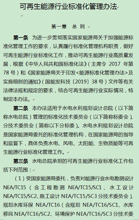 水電水利規(guī)劃設計總院為進一步貫徹落實國家能源局關于加強能源標準化管理工作的要求、認真履行標準化管理機構(gòu)職責、做好可再生能源行業(yè)標準化工作,根據(jù)《中華人民共和國標準化法》(主席令2017年第78號)和《國家能源局關于印發(fā)及實施細則的通知》(國能發(fā)科技〔2019〕38號)文件等有關法律法規(guī)和規(guī)定的要求,結(jié)合可再生能源行業(yè)實際情況,我院修訂形成了《可再生能源行業(yè)標準化管理辦法》,制定了《可再生能源行業(yè)標準管理實施細則》和《可再生能源行業(yè)標準化技術委員會管理實施細則》,F(xiàn)予以印發(fā),請認真遵照執(zhí)行。