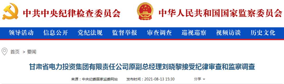 此次任職甘肅電投副總的劉曉黎也正在接受白銀市紀(jì)委監(jiān)委審查調(diào)查。
