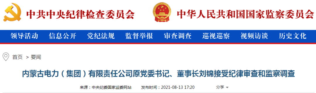據(jù)內(nèi)蒙古自治區(qū)紀(jì)委監(jiān)委消息:內(nèi)蒙古電力(集團(tuán))有限責(zé)任公司原黨委書記、董事長劉錦涉嫌嚴(yán)重違紀(jì)違法,目前正在接受紀(jì)律審查和監(jiān)察調(diào)查。