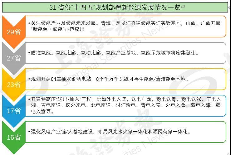 特高壓僅是能源新基建的一個(gè)方向。從各省份“十四五”規(guī)劃來(lái)看,地方都在積極加快或布局新能源,光伏、儲(chǔ)能、抽水蓄能、氫能等都是發(fā)力的重要方向。