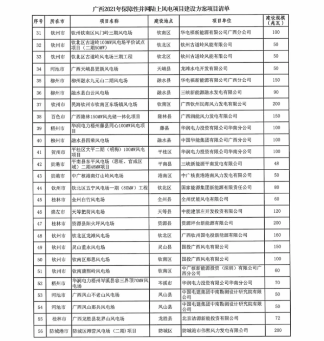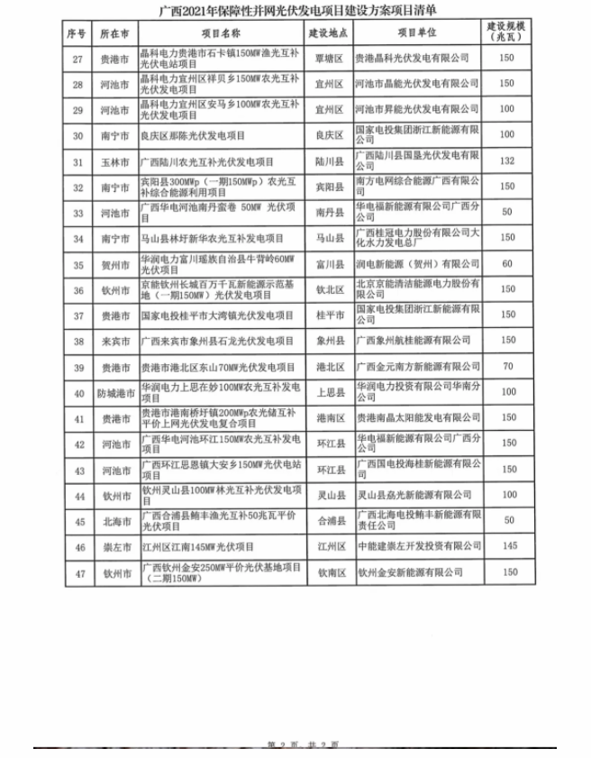 8月27日,廣西省能源局印發(fā)《關(guān)于2021年保障性并網(wǎng)陸上風(fēng)電和光伏發(fā)電項(xiàng)目建設(shè)方案的通知》。根據(jù)通知顯示,本次被納入2021年保障性規(guī)模的風(fēng)電、光伏項(xiàng)目有103個(gè),總規(guī)模為10.27GW。其中光伏項(xiàng)目共47個(gè),總規(guī)模為4660兆瓦,由21家企業(yè)開(kāi)發(fā)。以下為具體文件: