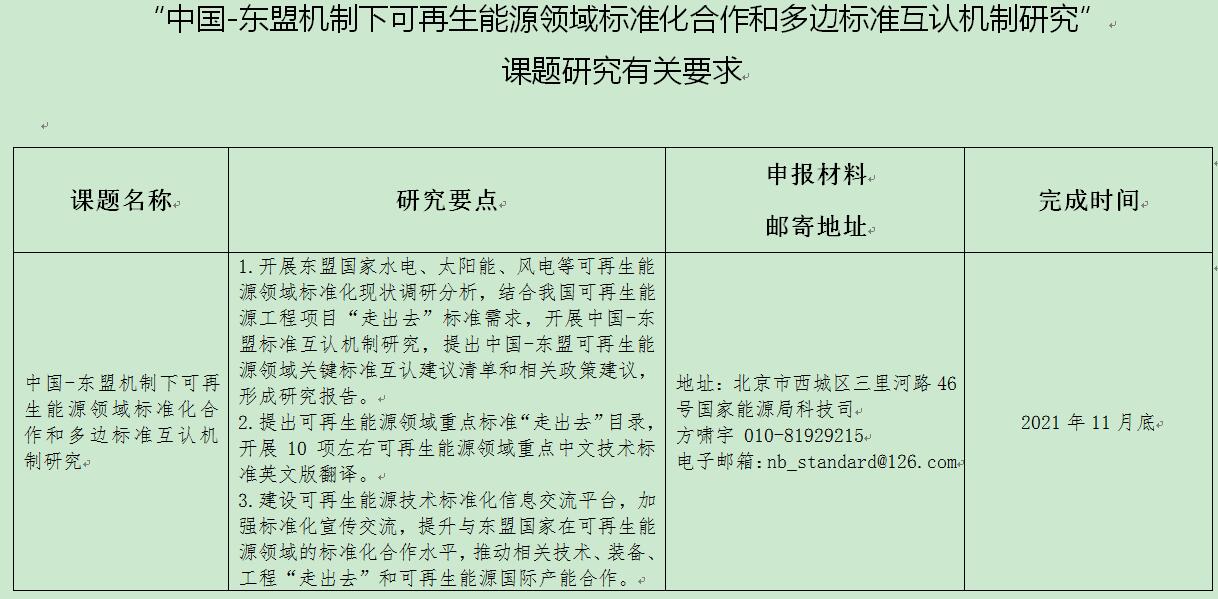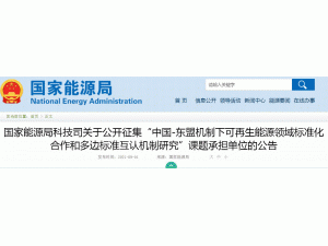 國家能源局科技司今日發(fā)布關于公開征集“中國-東盟機制下可再生能源領域標準化合作和多邊標準互認機制研究”課題承擔單位的公告,為做好“中國-東盟機制下可再生能源領域標準化合作和多邊標準互認機制研究”課題研究,根據(jù)國家能源局有關規(guī)定,從即日起開展研究課題承擔單位公開征集工作。申報時間為2021年9月1日至9