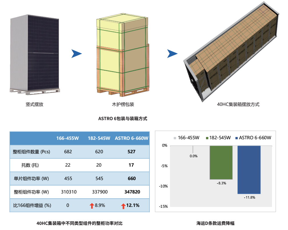 針對ASTRO 6產(chǎn)品大尺寸特性,正泰推出“豎式包裝+木護(hù)楞”方式,確保包裝和裝卸安全性,同時也突破了集裝箱對組件高度的限制。示意圖如下。一托共有31塊組件,將組件豎著緊密擺放,包裝箱內(nèi)外都用縱向與橫向打包帶固定,側(cè)面還增加防傾倒固定木護(hù)楞,保證整托組件包裝可靠。一托組件包裝后長寬高約為1.14m×1.34m×2.50m,在集裝箱中可直接立著并排擺放,全面兼容海運(yùn)貨柜規(guī)格。豎式包裝進(jìn)一步提高了集裝箱內(nèi)部體積的利用率。在標(biāo)準(zhǔn)40HC集裝箱中,ASTRO 6相比166組件可增加12%的裝載功率,比182組件增加約3%的裝載功率。經(jīng)測算ASTRO 6組件的海運(yùn)費(fèi)用比166組件降低11.8%,為物流環(huán)節(jié)創(chuàng)造較大的降本空間。