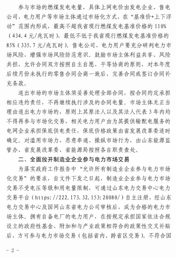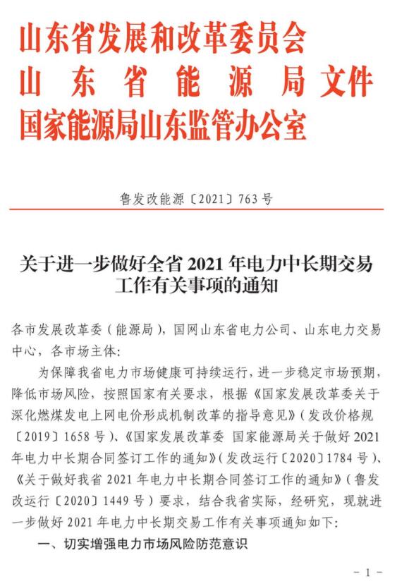日前,山東省發(fā)改委,能源局,能源監(jiān)管辦聯(lián)合發(fā)布《關(guān)于進一步做好我省2021年電力中長期交易工作有關(guān)事項的通知》,切實增強電力市場風險防范意識,全面放開制造業(yè)企業(yè)參與電力市場交易。全文如下: