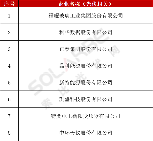其中,光伏相關(guān)企業(yè)有福耀玻璃、科華數(shù)據(jù)、正泰集團(tuán)、晶科能源、新特能源、凱盛科技、特變電工衡陽(yáng)變壓器有限公司、中環(huán)天儀股份有限公司8家。