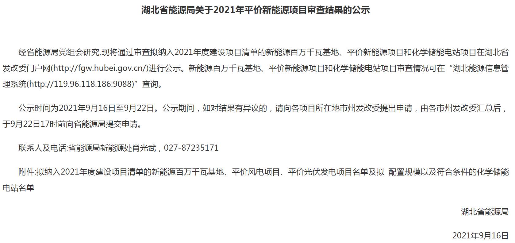 9月16日,湖北省能源局印發(fā)關(guān)于2021年平價新能源項目審查結(jié)果的公示。經(jīng)湖北省能源局黨組會研究,現(xiàn)將通過審查擬納入2021年度建設(shè)項目清單的新能源百萬千瓦基地、平價新能源項目和化學(xué)儲能電站項目在湖北省發(fā)改委門戶網(wǎng)進行公示。