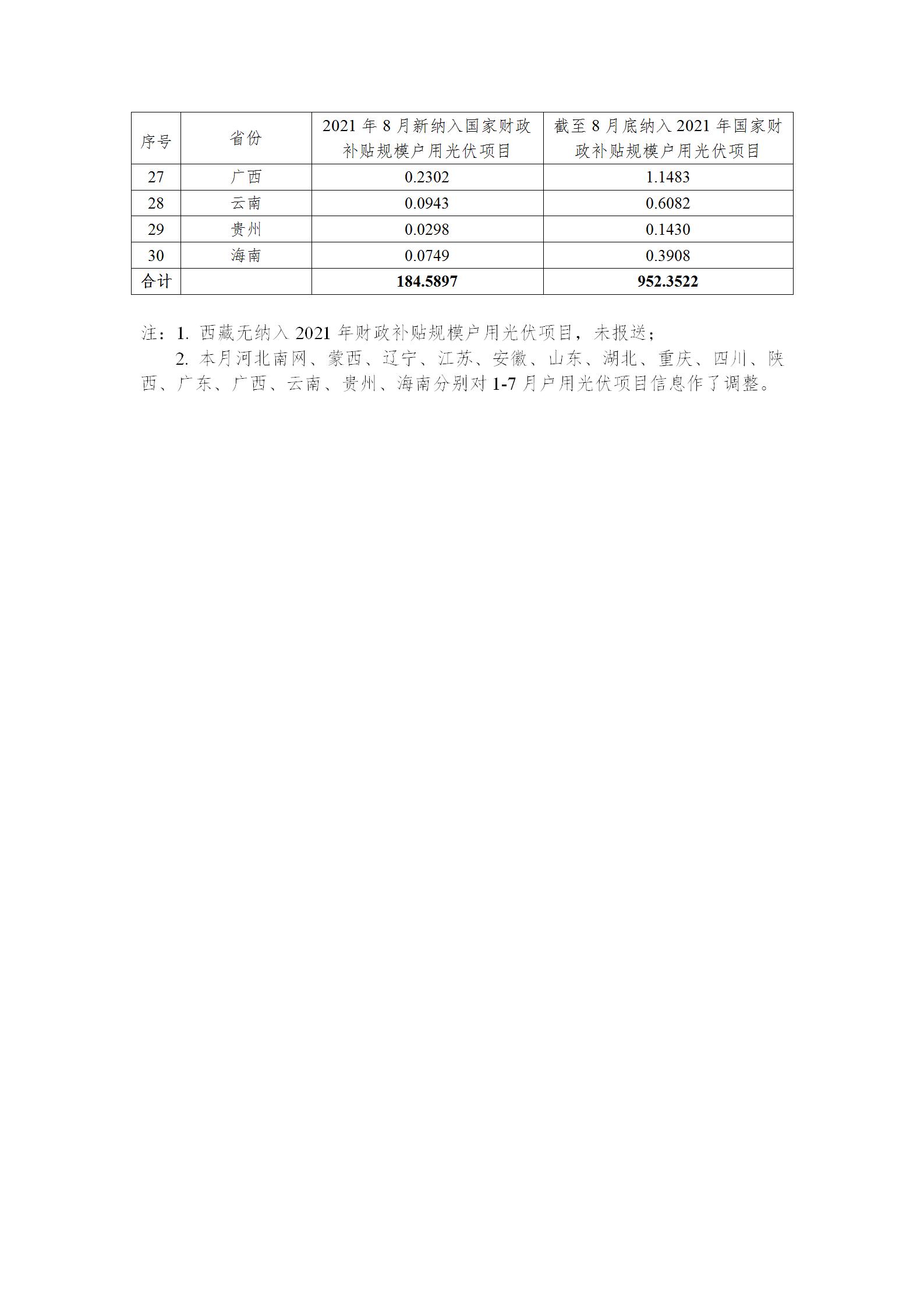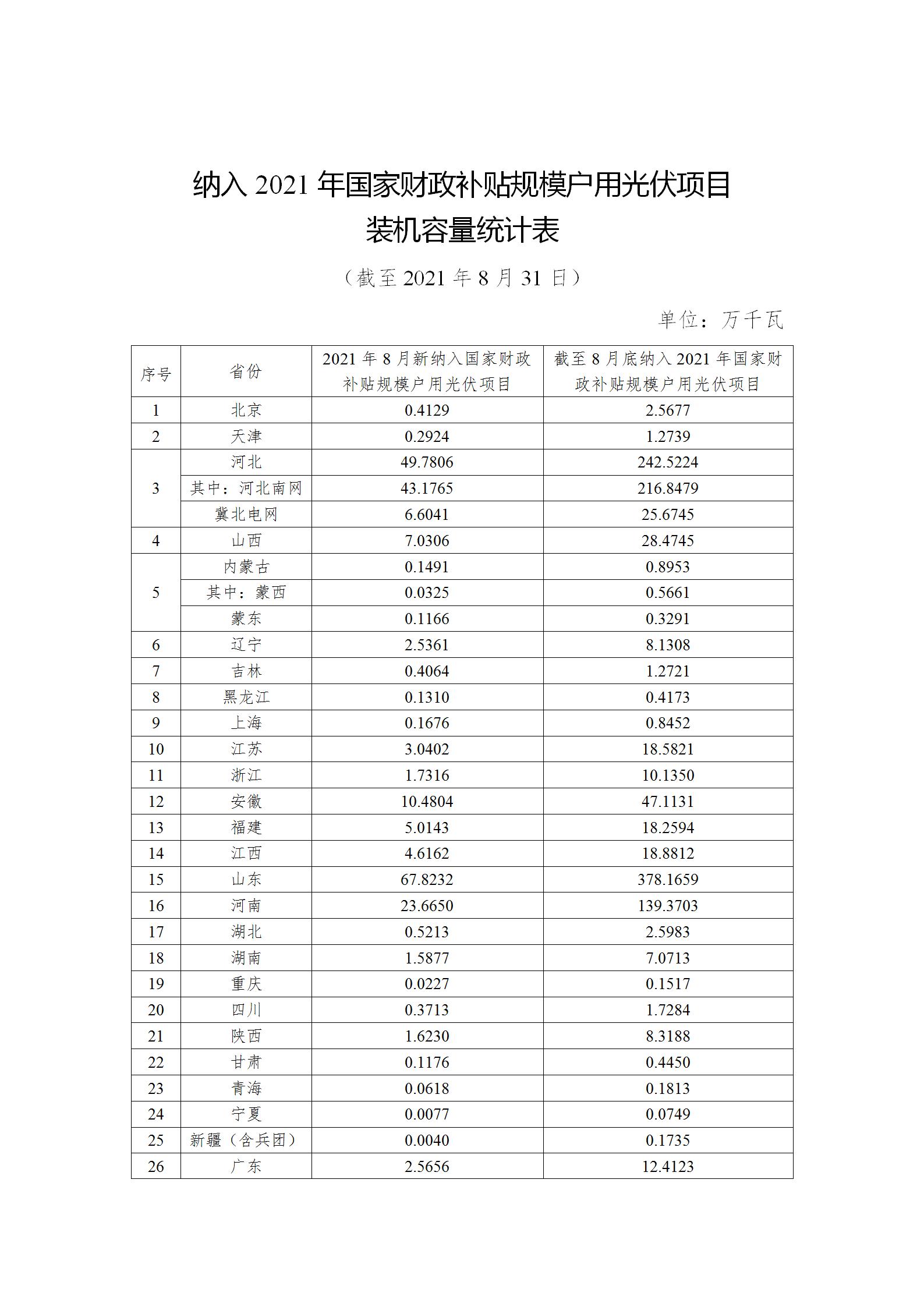 附表:納入2021年國(guó)家財(cái)政補(bǔ)貼規(guī)模戶(hù)用光伏項(xiàng)目裝機(jī)容量統(tǒng)計(jì)表(截至2021年8月31日)