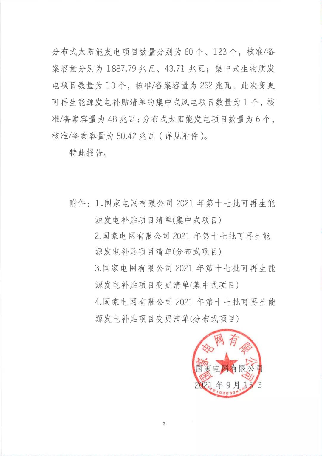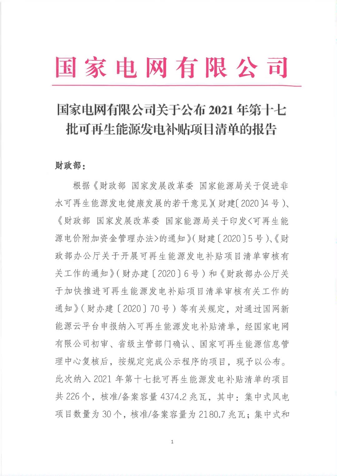 今日(9月18日),國家電網(wǎng)有限公司發(fā)布《關(guān)于公布2021年第十七批可再生能源發(fā)電補(bǔ)貼項(xiàng)目清單的公告》。此次納入補(bǔ)貼的項(xiàng)目共有226個(gè),核準(zhǔn)/備案容量4374.2MW。