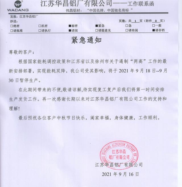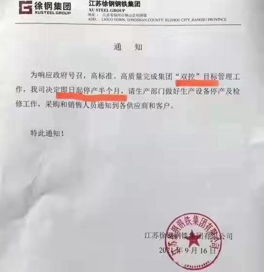 財聯(lián)社記者從徐州方面了解到,徐州地區(qū)一些重工業(yè)企業(yè)在近日收到限產(chǎn)、停產(chǎn)通知。記者獲得并經(jīng)核實的信息顯示,江蘇徐鋼鋼鐵集團(tuán)9月16日發(fā)出通知,為高標(biāo)準(zhǔn)、高質(zhì)量完成集團(tuán)“雙控”目標(biāo)管理工作,公司決定即日起停產(chǎn)半個月;江蘇華昌鋁廠有限公司決定自9月18日到9月30日期間暫停生產(chǎn)。