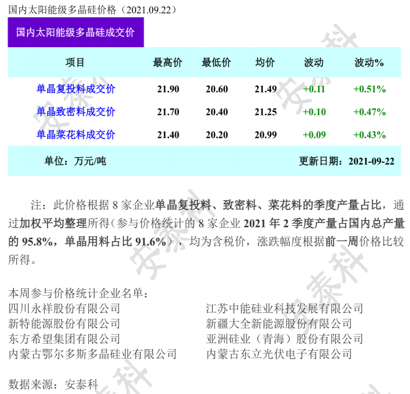 本周多晶硅價(jià)格繼續(xù)小幅上漲,其中單晶復(fù)投料、單晶致密料、單晶菜花料成交均價(jià)漲幅在0.5%左右,一線大廠新簽的少量復(fù)投料訂單最新成交價(jià)在21.7萬元/噸以上,略有上調(diào),其余企業(yè)本周少有簽單,只有個(gè)別散單和補(bǔ)單成交,價(jià)格相對(duì)持穩(wěn),故本周硅料價(jià)格依舊延續(xù)小幅上漲的走勢(shì)。