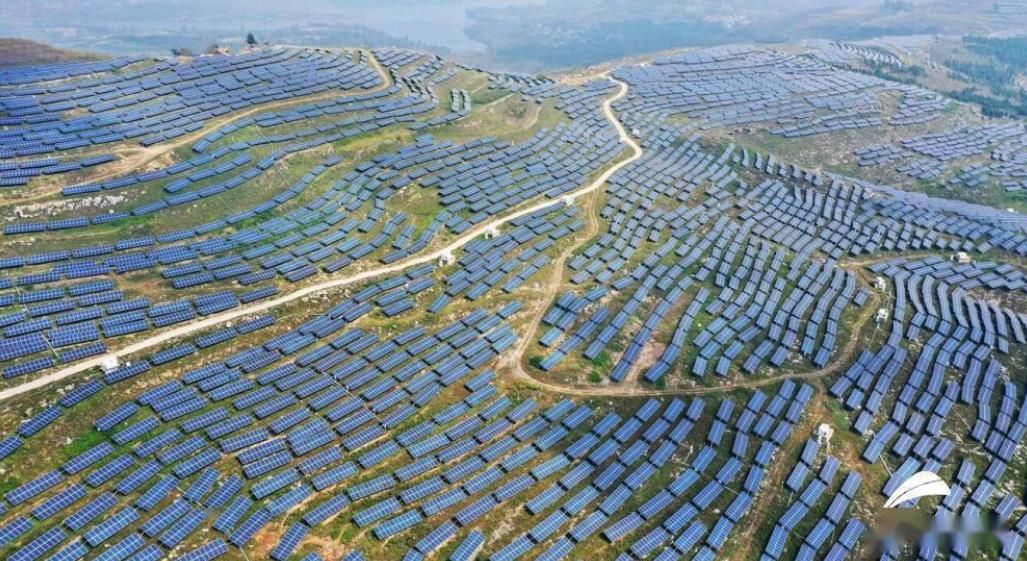 圖/綠色能源助力鄉(xiāng)村振興。這是位于臨沂市費(fèi)縣石井鎮(zhèn)荒山上的光伏扶貧發(fā)電站。