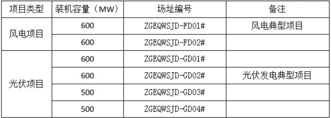 本次基地項目裝機容量為3400MW,共劃分為2個風電項目和4個光伏發(fā)電項目,其中,ZGEQWSJD-FD01#為風電項目、裝機容量600MW;ZGEQWSJD-FD02#為風電項目、裝機容量600MW;ZGEQWSJD-GD01#為光伏發(fā)電項目、裝機容量600MW;ZGEQWSJD-GD02#為光伏發(fā)電項目、裝機容量600MW;ZGEQWSJD-GD03#為光伏發(fā)電項目、裝機容量500MW;ZGEQWSJD-GD04#為光伏發(fā)電項目、裝機容量500MW;光伏發(fā)電項目采用農(nóng)光、牧光、林光互補等方式,帶動板下經(jīng)濟發(fā)展。