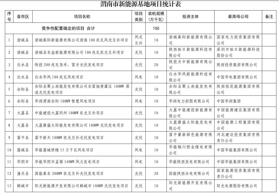 9月23日,陜西省能源局公示了渭南市新能源基地風(fēng)電光伏發(fā)電項(xiàng)目配置結(jié)果,根據(jù)專家評(píng)分,確定了排名靠前的13個(gè)項(xiàng)目共計(jì)150萬千瓦納入渭南市新能源基地。其中,風(fēng)電4個(gè)共40萬千瓦,光伏8個(gè)共100萬千瓦,風(fēng)光互補(bǔ)1個(gè)共10萬千瓦,共計(jì)353萬。