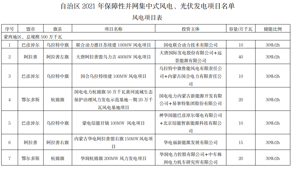 10月8日,內蒙古自治區(qū)能源局發(fā)布關于自治區(qū)2021年保障性并網(wǎng)集中式風電、光伏發(fā)電項目優(yōu)選結果的公示。根據(jù)《國家能源局關于2021年風電、光伏發(fā)電開發(fā)建設有關事項的通知》(國能發(fā)新能〔2021〕25號)和《內蒙古自治區(qū)能源局關于2021年風電、光伏發(fā)電開發(fā)建設有關事項的通知》(內能新能字〔2021〕574號)要求,內蒙
