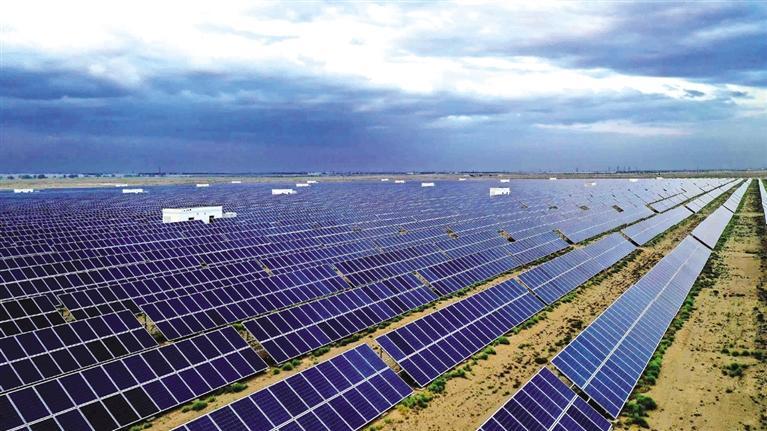 在酒泉金塔縣城西的廣闊戈壁,浩瀚萬(wàn)頃的光伏發(fā)電板如同一排排等待檢閱的士兵排列整齊,場(chǎng)面蔚為壯觀。