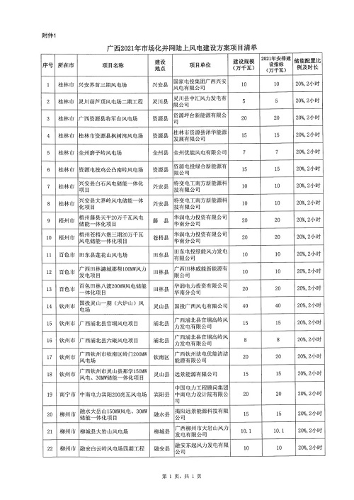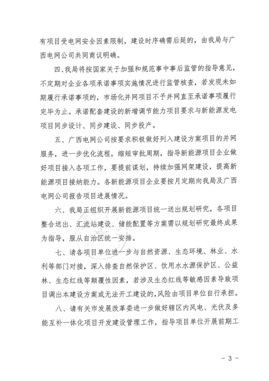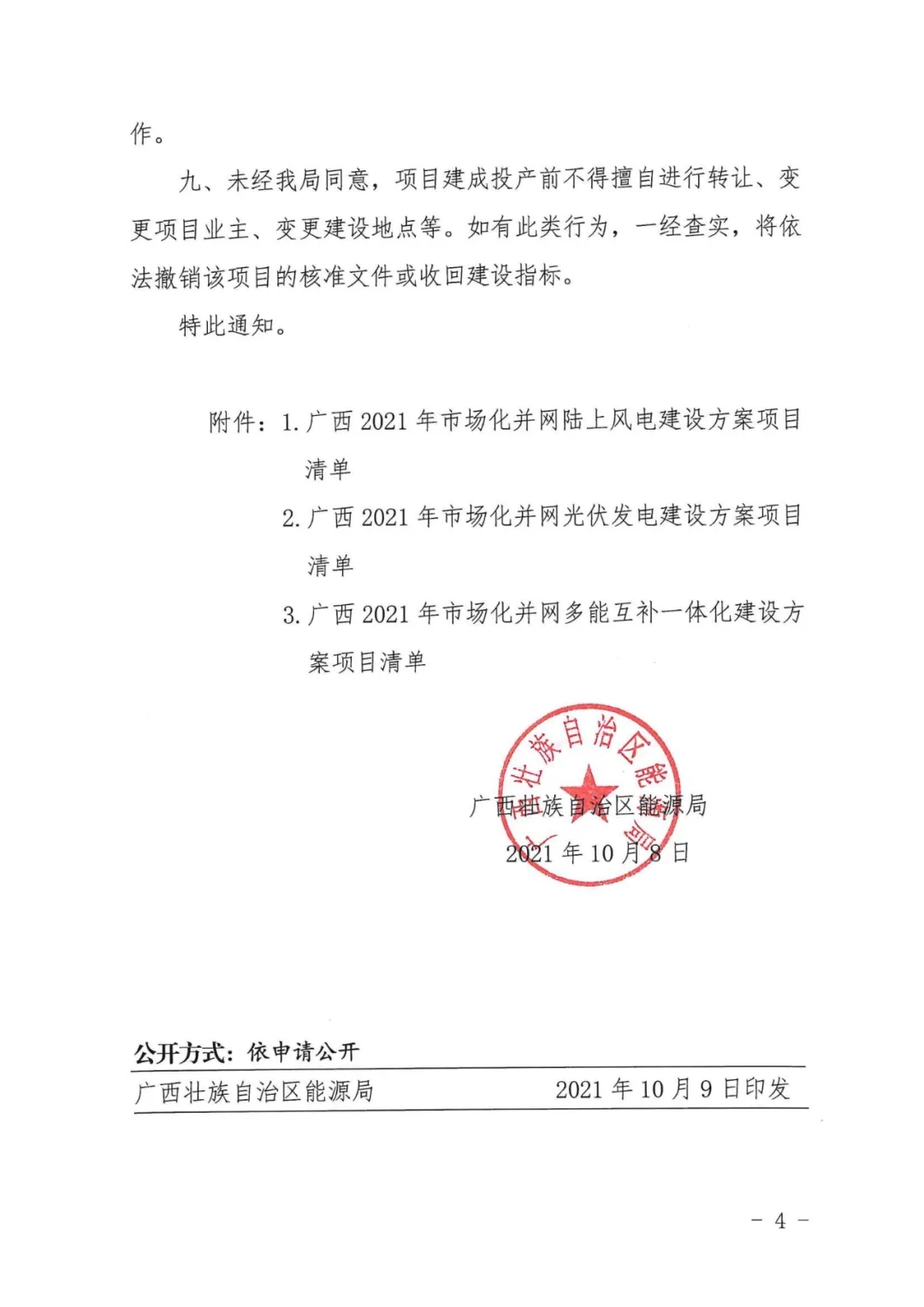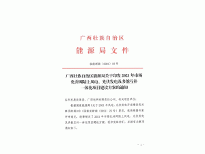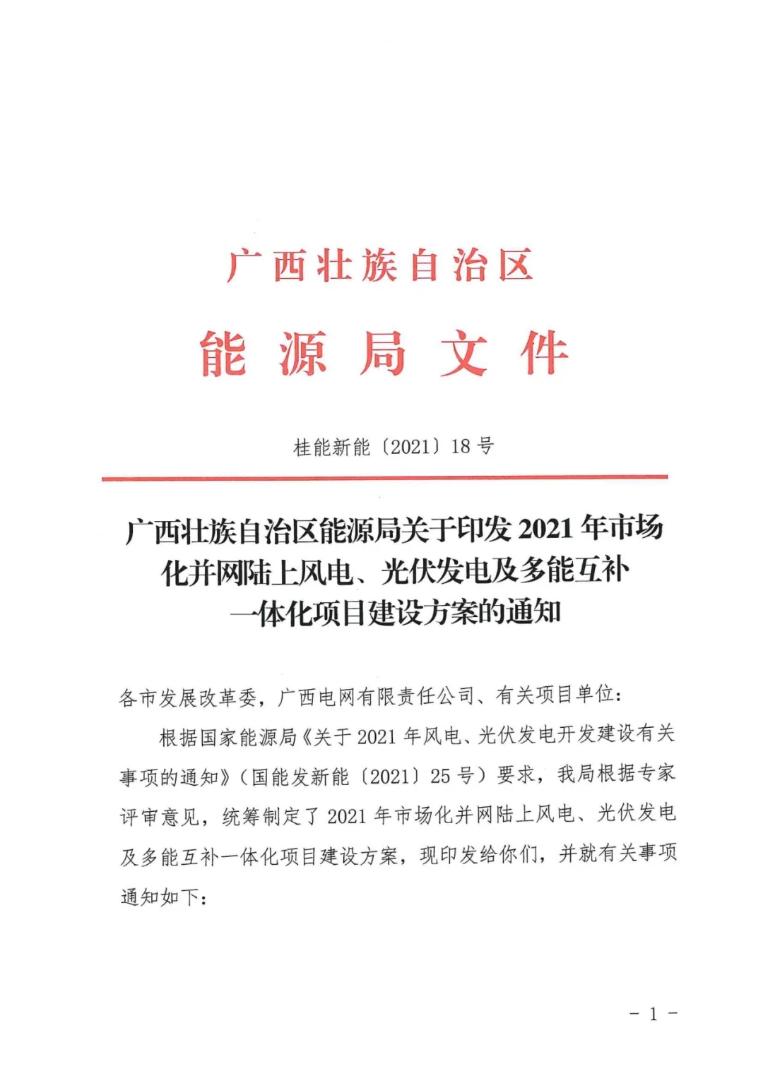 10月9日,廣西壯族自治區(qū)能源局正式印發(fā)《2021年市場(chǎng)化并網(wǎng)陸上風(fēng)電、光伏發(fā)電及多能互補(bǔ)一體化項(xiàng)目建設(shè)方案的通知》,列入2021年市場(chǎng)化并網(wǎng)陸上風(fēng)電建設(shè)方案的項(xiàng)目共22個(gè),總規(guī)模325.1萬(wàn)千瓦。2021年安排325.1萬(wàn)千瓦,配20%*2h儲(chǔ)能;列入2021年市場(chǎng)化并網(wǎng)光伏發(fā)電建設(shè)方案的項(xiàng)目共17個(gè),總規(guī)模395.4