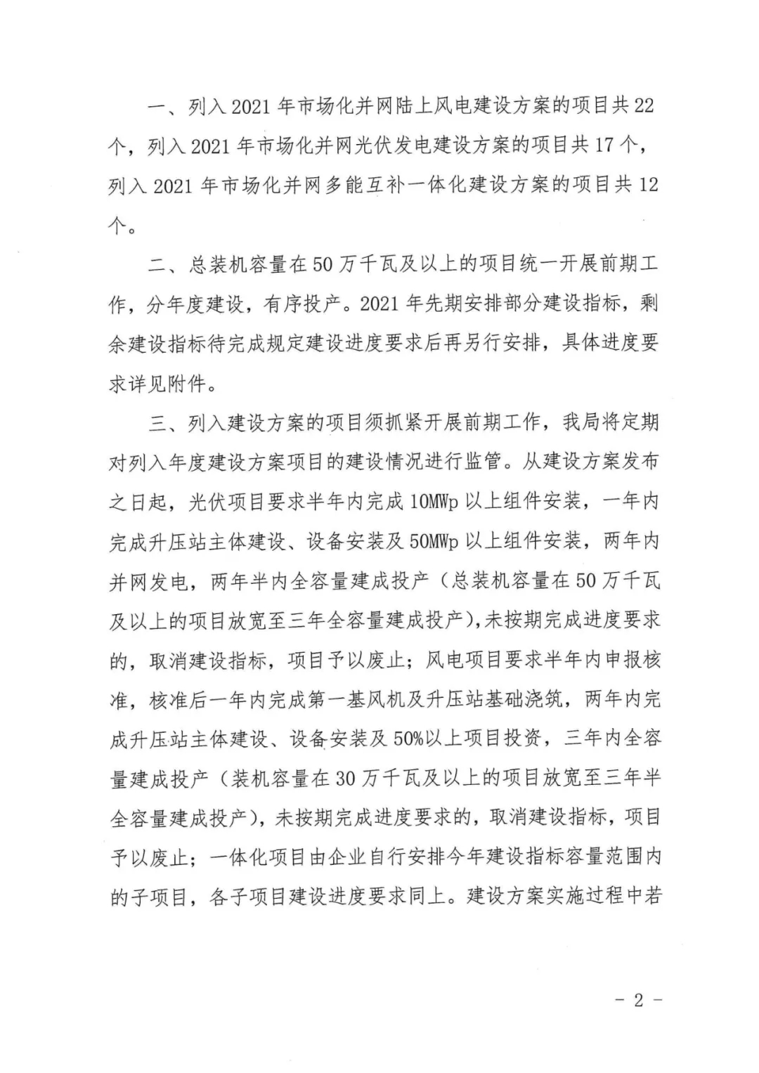 10月9日,廣西壯族自治區(qū)能源局正式印發(fā)《2021年市場(chǎng)化并網(wǎng)陸上風(fēng)電、光伏發(fā)電及多能互補(bǔ)一體化項(xiàng)目建設(shè)方案的通知》,列入2021年市場(chǎng)化并網(wǎng)陸上風(fēng)電建設(shè)方案的項(xiàng)目共22個(gè),總規(guī)模325.1萬(wàn)千瓦。2021年安排325.1萬(wàn)千瓦,配20%*2h儲(chǔ)能;列入2021年市場(chǎng)化并網(wǎng)光伏發(fā)電建設(shè)方案的項(xiàng)目共17個(gè),總規(guī)模395.4萬(wàn)千瓦,2021年安排330.4萬(wàn)千瓦,配15%*2h儲(chǔ)能;列入2021年市場(chǎng)化并網(wǎng)多能互補(bǔ)一體化建設(shè)方案的項(xiàng)目共12個(gè),總規(guī)模1365.5萬(wàn)千瓦,2021年安排544萬(wàn)千瓦。