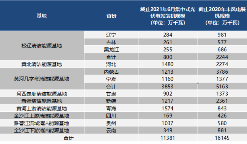 這九大清潔能源基地共囊括12個(gè)省份,截止2021年6月,這12個(gè)省份集中式光伏裝機(jī)規(guī)模達(dá)11381萬(wàn)千瓦。截止2020年末,這12個(gè)省份風(fēng)電裝機(jī)規(guī)模達(dá)16145萬(wàn)千瓦。