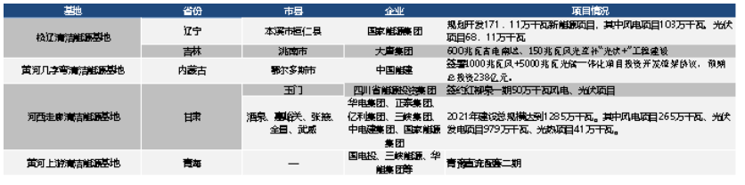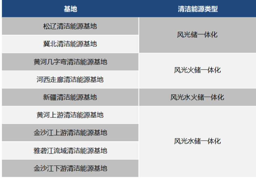 其中,松遼清潔能源基地和冀北清潔能源基地為“風(fēng)光儲(chǔ)一體化”基地;黃河幾字彎清潔能源基地和河西走廊清潔能源基地為“風(fēng)光火儲(chǔ)一體化”基地;新疆清潔能源為“風(fēng)光水火儲(chǔ)一體化”基地;黃河上游清潔能源基地、金沙江上游清潔能源基地、雅礱江流域清潔能源基地、金沙江下游清潔能源基地為“風(fēng)光水儲(chǔ)一體化”基地。