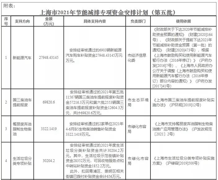 1、按照《財政部關(guān)于下達(dá)2020年節(jié)能減排補(bǔ)助資金預(yù)算的通知》(財建[2020]164號)、《財政部關(guān)于提前下達(dá)2021年節(jié)能減排補(bǔ)助資金預(yù)算(第一批)的通知》(財建[2020]473號),根據(jù)《上海市鼓勵購買和使用新能源汽車暫行辦法(2016年修訂)》(滬府辦發(fā)[2016]7號)、《上海市人民政府辦公廳關(guān)于調(diào)整〈上海市鼓勵購買和使用新能源汽車暫行辦法(2016年修訂)部分內(nèi)容的通知〉》(滬府辦發(fā)[2017]41號)等規(guī)定,安排經(jīng)審核通過的6903輛新能源汽車購車補(bǔ)貼資金27948.43145萬元。