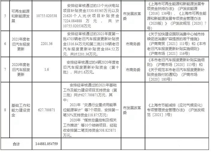5、按照《上海市可再生能源和新能源發(fā)展專項資金扶持辦法》(滬發(fā)改能源〔2016〕136號)、《上海市可再生能源和新能源發(fā)展專項資金管理辦法(2020版)》(滬發(fā)改規(guī)范〔2020〕7號)等相關(guān)規(guī)定,安排經(jīng)審核通過的13個光伏電站項目以及21620個人光伏項目補(bǔ)貼資金,共計10755.020538萬元。