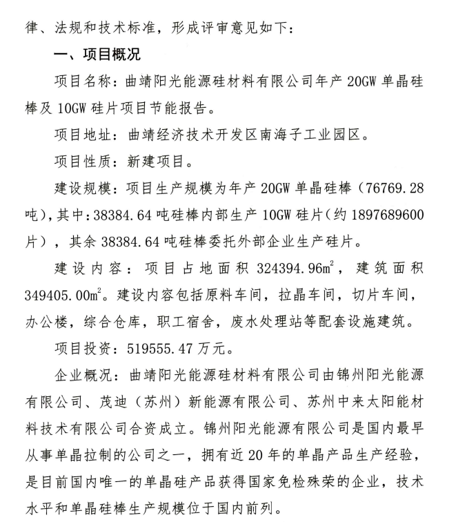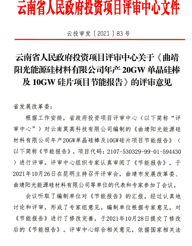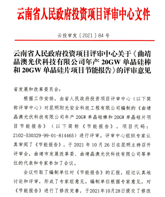 從云南發(fā)改委官網(wǎng)獲悉:11月2日,云南省發(fā)展和改革委員會(huì)發(fā)布通告,原則同意曲靖陽(yáng)光能源硅材料有限公司年產(chǎn)20GW單晶硅棒及10GW硅片項(xiàng)目節(jié)能報(bào)告、曲靖晶澳光伏科技有限公司年產(chǎn)20GW單晶硅棒和20GW單晶硅片項(xiàng)目節(jié)能報(bào)告的審查意見。