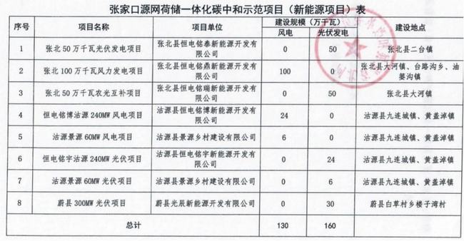其中,張北縣將建設(shè)100萬千瓦風(fēng)力發(fā)電項(xiàng)目、50萬千瓦光伏發(fā)電項(xiàng)目和50萬千瓦農(nóng)光互補(bǔ)項(xiàng)目,沽源縣將建設(shè)24+6萬千瓦風(fēng)力發(fā)電項(xiàng)目、24+6萬千瓦光伏項(xiàng)目,蔚縣則將建設(shè)30萬千瓦光伏項(xiàng)目。項(xiàng)目名單如下: