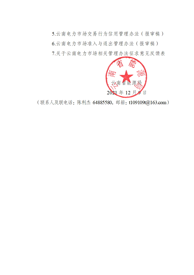 從云南省能源局官網(wǎng)獲悉:12月9日,云南省能源局印發(fā)關(guān)于公開征求云南電力市場管理辦法意見的函,就云南電力市場準(zhǔn)入與退出、交易組織、市場結(jié)算、零售交易、交易行為信用管理、信息披露等6個管理辦法,向社會公開征求意見。