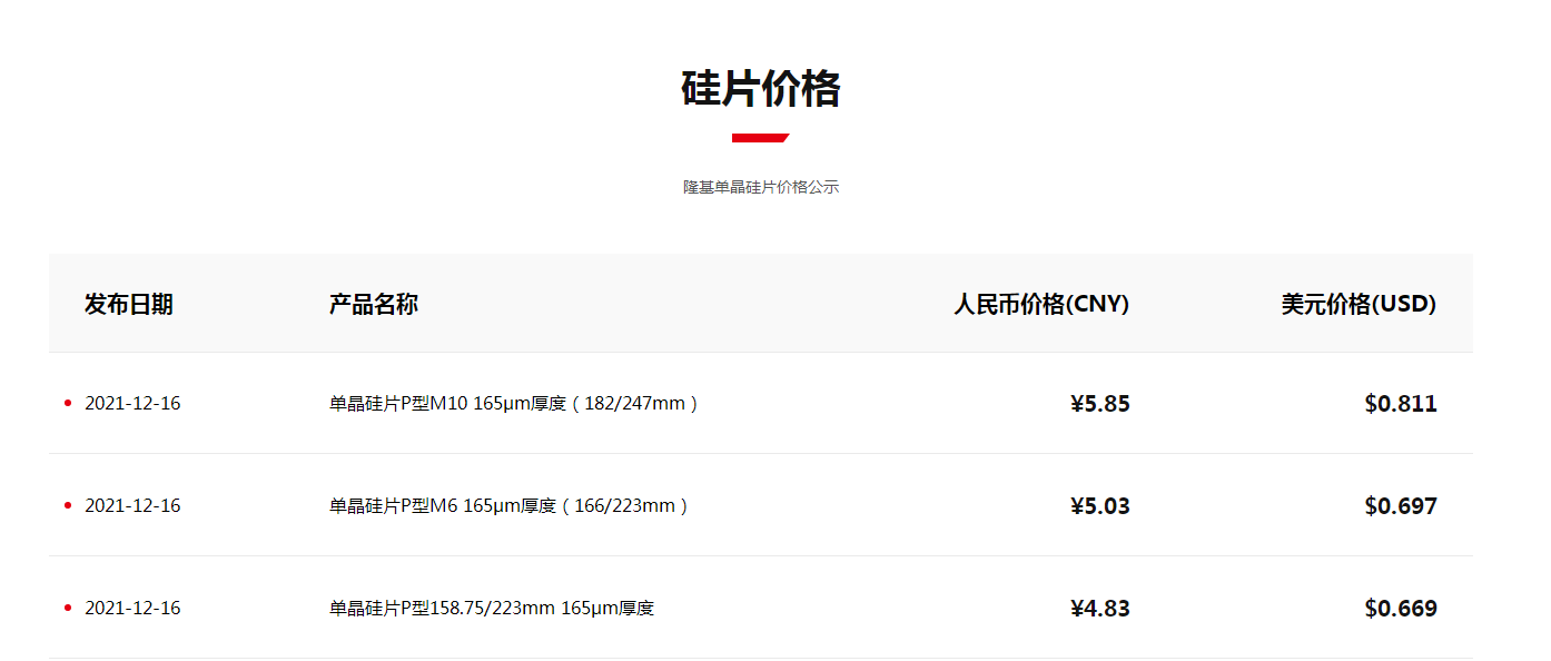 今日(12月16日),隆基股份官網(wǎng)發(fā)布了單晶硅片最新報價。