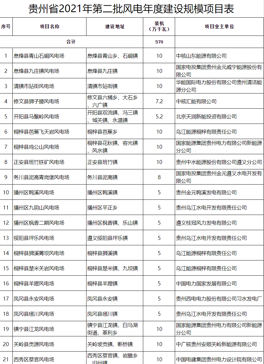 從貴州省能源局獲悉:24日,貴州省印發(fā)關(guān)于下達(dá)我省2021年第二批風(fēng)電年度建設(shè)規(guī)模項目的通知,經(jīng)對各市(州)上報的風(fēng)電項目進(jìn)行優(yōu)選,研究制定了貴州省2021年第二批風(fēng)電年度建設(shè)規(guī)模項目80個,裝機(jī)570萬千瓦。