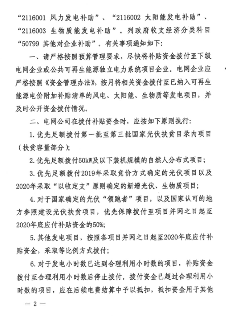 公司嚴(yán)格按照《財政部關(guān)于下達(dá)2021年可再生能源電價附加補助資金預(yù)算的通知》(財資〔2021〕94號)中明確的補貼資金撥付原則和順序,在收到財政部撥付款項后,對納入補貼目錄或清單且滿足結(jié)算條件的各類項目進(jìn)行及時、足額轉(zhuǎn)付。具體原則以各省電力公司公告為準(zhǔn)。