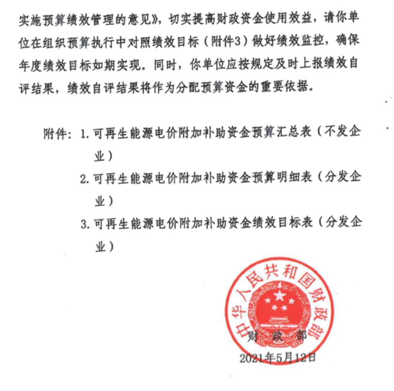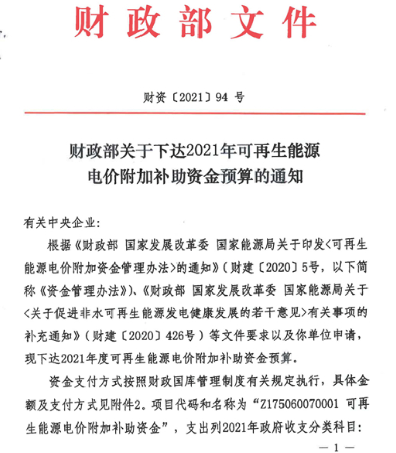 附件:《財政部關(guān)于下達(dá)2021年可再生能源電價附加補助資金預(yù)算的通知》(財資〔2021〕94號)