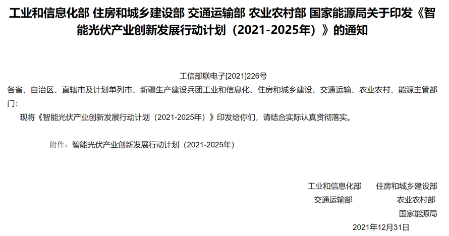 工信部網(wǎng)站1月4日消息,工業(yè)和信息化部、住房和城鄉(xiāng)建設(shè)部、交通運(yùn)輸部、農(nóng)業(yè)農(nóng)村部、國(guó)家能源局日前印發(fā)《智能光伏產(chǎn)業(yè)創(chuàng)新發(fā)展行動(dòng)計(jì)劃(2021-2025年)》。