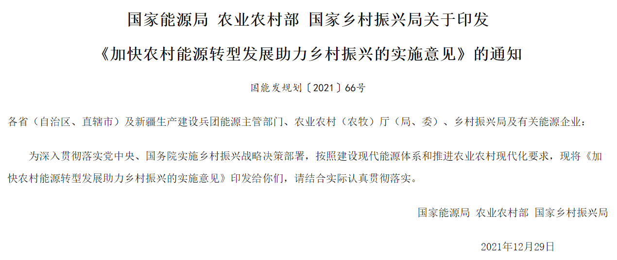 據(jù)國(guó)家能源局消息,為深入貫徹落實(shí)黨中央、國(guó)務(wù)院實(shí)施鄉(xiāng)村振興戰(zhàn)略決策部署,按照建設(shè)現(xiàn)代能源體系和推進(jìn)農(nóng)業(yè)農(nóng)村現(xiàn)代化要求,國(guó)家能源局、農(nóng)業(yè)農(nóng)村部及國(guó)家鄉(xiāng)村振興局今日印發(fā)《加快農(nóng)村能源轉(zhuǎn)型發(fā)展助力鄉(xiāng)村振興的實(shí)施意見》。實(shí)施意見提出,到2025年,擬建成一批農(nóng)村能源綠色低碳試點(diǎn),風(fēng)電、太陽(yáng)能、生物質(zhì)能、地?zé)崮艿日嫁r(nóng)村能源