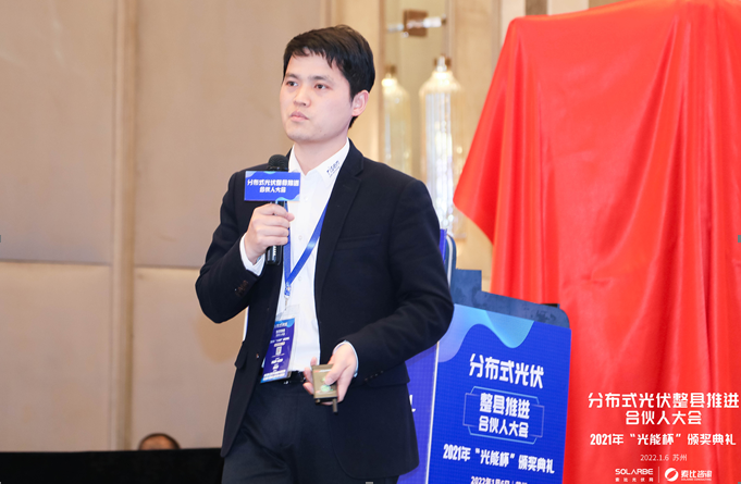 1月6日, 2021年度“光能杯”跨年分享會/分布式整縣推進合伙人大會暨頒獎盛典在蘇州盛大開幕,知名光伏企業(yè)代表齊聚盛會,共同回顧2021光伏產(chǎn)業(yè)斐然成績,展望2022全新發(fā)展機遇。高功率組件技術(shù)領跑企業(yè)東方日升出席活動,中國區(qū)銷售技術(shù)負責人鄧斌以《東方日升210超高功率組件助力分布式發(fā)展》為主題發(fā)表演講,探索“整縣推進”下,210產(chǎn)品在分布式場景高價值應用方案。