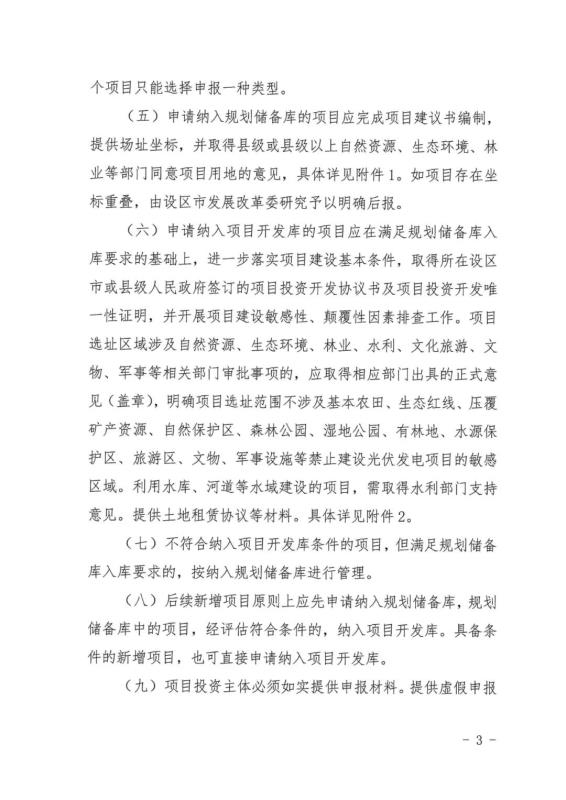 通知明確,集中式光伏發(fā)電規(guī)劃項(xiàng)目庫分為開發(fā)庫和儲(chǔ)備庫兩類。正在開展前期工作,初步落實(shí)土地條件的項(xiàng)目可納入儲(chǔ)備庫;前期工作比較完善,支持文件完備,且簽訂項(xiàng)目投資開發(fā)協(xié)議并已落實(shí)用地的項(xiàng)目可納入開發(fā)庫。未列入項(xiàng)目開發(fā)庫的集中式光伏發(fā)電項(xiàng)目,原則上不得參與新能源建設(shè)年度競爭性配置。