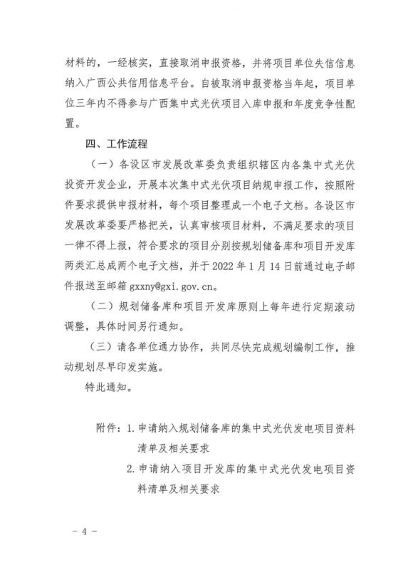 1月8日,廣西發(fā)改委印發(fā)《開展"十四五"集中式光伏發(fā)電項(xiàng)目納規(guī)工作的通知》,就建立集中式光伏規(guī)劃項(xiàng)目庫給出指導(dǎo)意見。通知明確,集中式光伏發(fā)電規(guī)劃項(xiàng)目庫分為開發(fā)庫和儲(chǔ)備庫兩類。正在開展前期工作,初步落實(shí)土地條件的項(xiàng)目可納入儲(chǔ)備庫;前期工作比較完善,支持文件完備,且簽訂項(xiàng)目投資開發(fā)協(xié)議并已落實(shí)用地的項(xiàng)目可納入開發(fā)