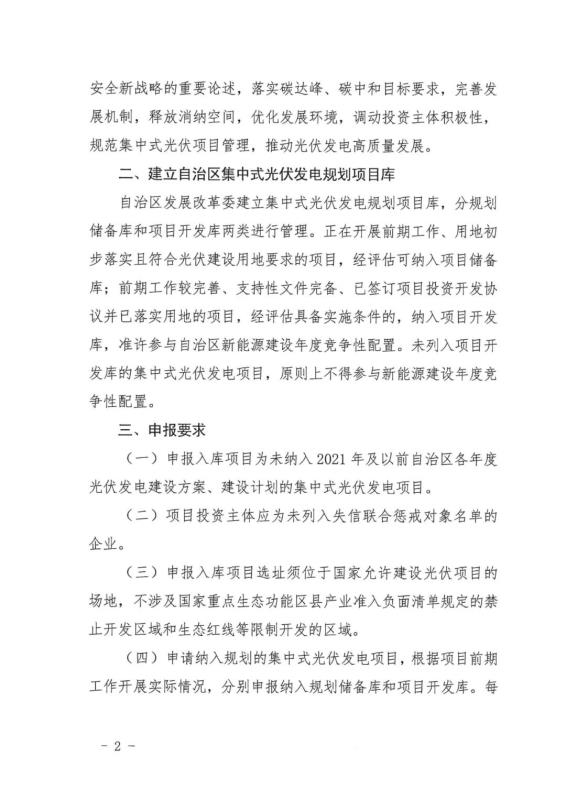 在具體申報(bào)要求方面,主要為未納入2021年及以前自治區(qū)各年度光伏發(fā)電建設(shè)方案、建設(shè)計(jì)劃的集中式光伏發(fā)電項(xiàng)目。項(xiàng)目建設(shè)地不涉及禁止開發(fā)區(qū)域和生態(tài)紅線等限制開發(fā)的區(qū)域。