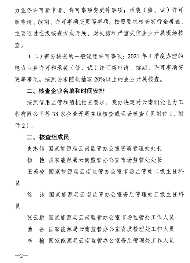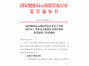 國(guó)家能源局云南監(jiān)管辦公室17日印發(fā)關(guān)于開(kāi)展2022年1季度電力資質(zhì)許可事中事后監(jiān)管核查工作的通知,決定對(duì)2021年內(nèi)辦理的電力業(yè)務(wù)許可申請(qǐng)、許可事項(xiàng)變更等事項(xiàng)開(kāi)展全覆蓋核查。
