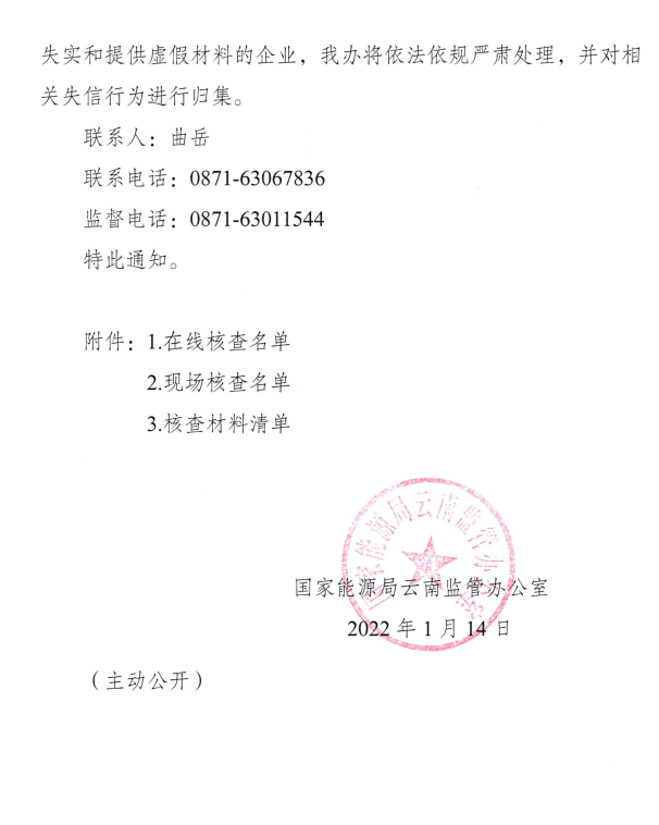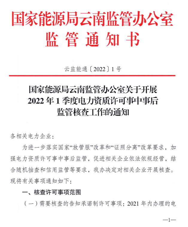 國(guó)家能源局云南監(jiān)管辦公室17日印發(fā)關(guān)于開(kāi)展2022年1季度電力資質(zhì)許可事中事后監(jiān)管核查工作的通知,決定對(duì)2021年內(nèi)辦理的電力業(yè)務(wù)許可申請(qǐng)、許可事項(xiàng)變更等事項(xiàng)開(kāi)展全覆蓋核查。通知如下:
