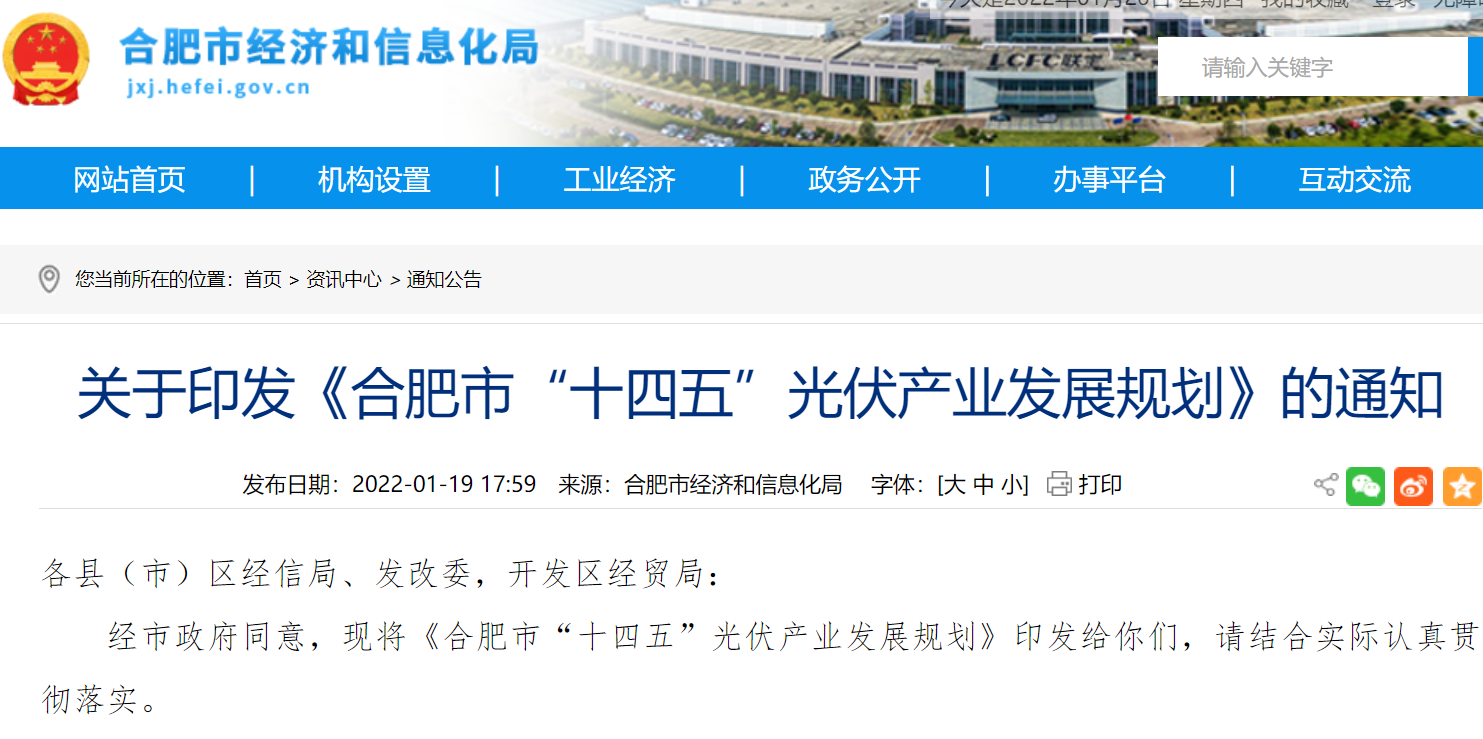 從合肥市經(jīng)濟(jì)和信息化局獲悉:日前,合肥市經(jīng)濟(jì)和信息化局印發(fā)《合肥市“十四五”光伏產(chǎn)業(yè)發(fā)展規(guī)劃》(以下簡稱《規(guī)劃》)!兑(guī)劃》提出,以“光伏第一城”建設(shè)為目標(biāo),未來5年主要形成以高端光伏制造、新型儲能裝備、智慧光伏系統(tǒng)集成、分布式智慧光伏發(fā)電示范應(yīng)用為主的特色光伏產(chǎn)業(yè)體系,打造國家級光伏產(chǎn)品認(rèn)證、分析、檢測中心,培育建設(shè)戰(zhàn)略性新興產(chǎn)業(yè)基地和先進(jìn)制造業(yè)集群。