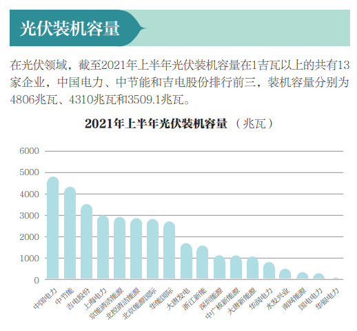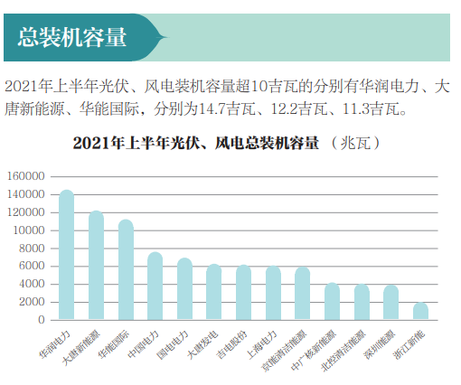 據(jù)能源評(píng)論報(bào)道:構(gòu)建新型電力系統(tǒng),意味著風(fēng)電、光伏愈加重要,而央企與地方國(guó)企經(jīng)過(guò)數(shù)年的積累,已成為風(fēng)電、光伏開(kāi)發(fā)主力軍。2021年上半年的上市央企及地方國(guó)企風(fēng)電、光伏裝機(jī)情況已經(jīng)披露,值得關(guān)注: