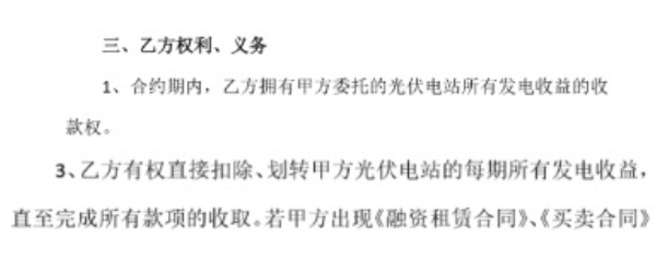 紅星資本局在采訪(fǎng)中發(fā)現(xiàn),部分光伏公司會(huì)在合同中約定,農(nóng)戶(hù)要先將電站收益先劃給光伏公司賬戶(hù),再由光伏公司分給一部分收益給農(nóng)戶(hù)。甚至為了方便操作,光伏公司會(huì)收走農(nóng)戶(hù)的銀行卡。