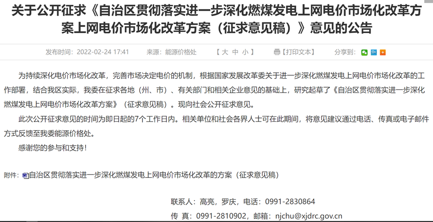 近日,新疆自治區(qū)發(fā)改委就貫徹落實進一步深化燃煤發(fā)電上網電價市場化改革方案(征求意見稿)向社會公開征求意見。意見稿提出,完善新能源電價機制。發(fā)展改革部門要研究完善有利于新能源發(fā)展的價格機制,嚴格可再生能源消納權重考核,推動新能源電價與煤電價格合理銜接,引導企業(yè)投資積極性,更好地體現(xiàn)綠色電力價值。