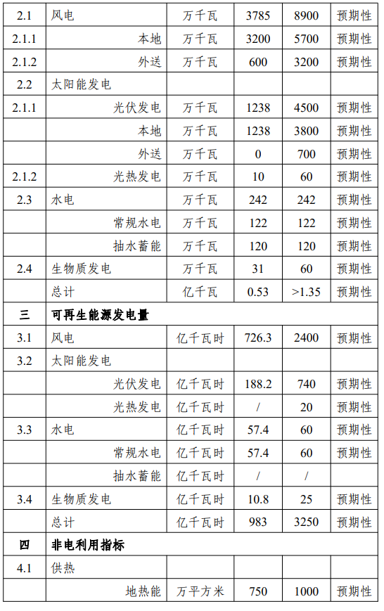 ——可再生能源總量目標(biāo)。2025 年,自治區(qū)可再生能源供給能力顯著提高,可再生能源生產(chǎn)總量超過 9000 萬噸標(biāo)準(zhǔn)煤,可再生能源區(qū)內(nèi)利用量超過 6000 萬噸標(biāo)準(zhǔn)煤,占當(dāng)年一次能源消費總量的 18%以上,超過全國平均水平。