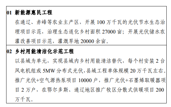 新能源惠民工程。開展農(nóng)網(wǎng)鞏固提升工程,與提升風(fēng)電、光伏等分布式電能就近接入有機(jī)結(jié)合,提升鄉(xiāng)村電氣化水平,提高農(nóng)電服務(wù)水平,推進(jìn)農(nóng)網(wǎng)智能化。在電網(wǎng)基礎(chǔ)建設(shè)薄弱且用電負(fù)荷分散度較高的偏遠(yuǎn)末端配電網(wǎng)、農(nóng)區(qū)牧區(qū)等地區(qū),因地制宜推動風(fēng)電、光伏開發(fā)。在通遼、赤峰等盟市,開展光伏儲水農(nóng)灌改善工程和光伏節(jié)水生態(tài)治理工程示范,提升電網(wǎng)農(nóng)灌期供電可靠性,構(gòu)建新型節(jié)水灌溉系統(tǒng),有效實現(xiàn)節(jié)水節(jié)能、生態(tài)恢復(fù)治理。自治區(qū)鄉(xiāng)村人口約 960 萬人,開展 100 萬千瓦新能源惠民工程,滿足農(nóng)村牧區(qū)清潔用能需求。