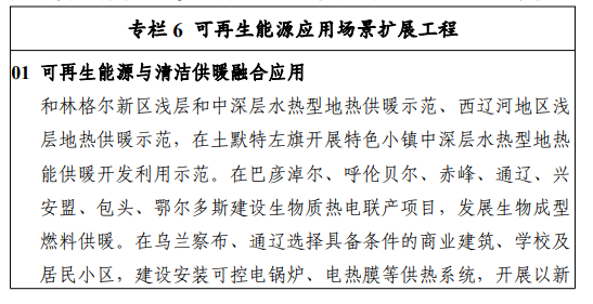 持續(xù)推廣可再生能源清潔供暖。發(fā)揮自治區(qū)風(fēng)能、光伏、農(nóng)林、地?zé)豳Y源優(yōu)勢,建立多元化可再生能源清潔供暖體系,促進(jìn)環(huán)境質(zhì)量和人民生活條件改善。在呼包鄂城市群積極推動中深層地?zé)崮芤?guī)模化供暖示范,創(chuàng)新城市用能新模式。在蒙東地區(qū)發(fā)展生物質(zhì)熱電聯(lián)產(chǎn)項目,探索以農(nóng)林生物質(zhì)、生物質(zhì)成型燃料等為燃料的生物質(zhì)鍋爐供熱方式,有效保護(hù)城鄉(xiāng)環(huán)境。在呼和浩特、包頭、烏蘭察布、通遼等地,開展清潔電供暖示范。